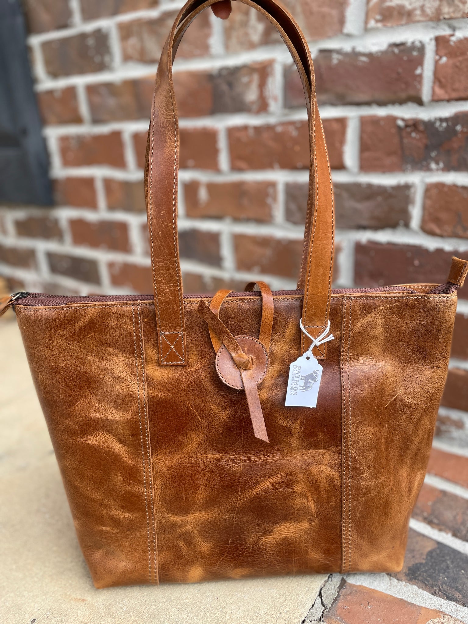 A stylish wide tote bag, with zipper closure and shoulder straps. Use as a large purse or book bag!